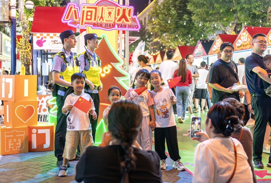 作为今年旅游节重要组成部分,位于上海市崇明区城桥镇八一路的“南门”夜市成为了游客们打卡的热门区域。面对夜市人流密集、业态复杂的挑战,崇明分局创新建立了“1+3+N”多元联动机制,以公安为主导,整合文旅、城管、市场监管等职能部门,协同消防、医疗、志愿服务等社会资源,构建“全时段、全要素、全覆盖”治理格局。将夜市周边高清公共视频全部接入属地派出所综合指挥室,织密静态感知网络。在空中维度,警用无人机常态化开展高空巡航,化身“空中哨兵”,实时观测人群密度,对局部拥堵区域自动预警。一线民警全部配备5G执法记录仪,现场情况实时回传。“一屏观全域”智慧指挥平台整合多源数据,突发事件平均响应时间缩短至2分钟。在现场管控方面,实施“星光守护”专项行动,在夜市核心区域设置了3个固定警务服务站,配备6个流动巡逻组,佩戴LED警示灯的民警全天候巡防。深化警商协作,建立“南门夜市安全联盟”,及时化解各类矛盾纠纷9起,营造了和谐有序消费环境。
